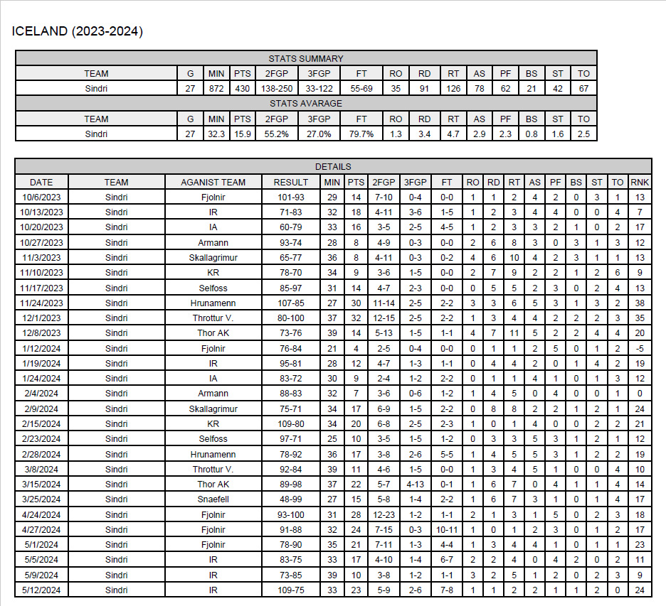 2023-2024: UMF Sindri Hofn (Iceland-Division I, starting five): 27 games: 15.9ppg, 4.7rpg, 2.9apg, 1.6spg, FGP: 55.2%, 3PT: 27.0%,